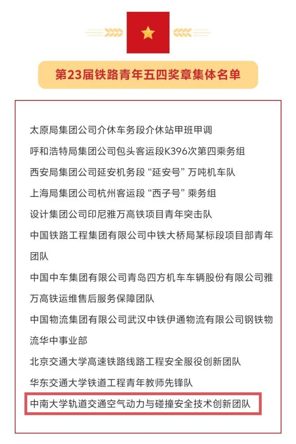 5月4日,为充分发挥青年典型模范带头作用,引领和激励广大青年在实现铁路高质量发展进程中接续奋斗,全国铁道团委颁授第23届铁路青年五四奖章,色情app 轨道交通空气动力与碰撞安全技术创新团队获评“铁路青年五四奖章集体”,全国仅三个高校团队获此荣誉。