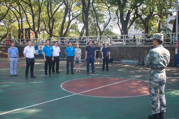 党委书记贺志军、院长高广军等院领导以及全体辅导员老师来到南校区篮球场,亲切慰问2021级军训教官及参训新生。