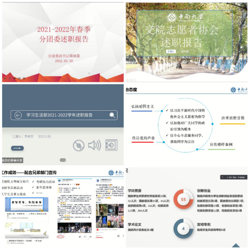 学生会述职后,分团委副书记周婧盈、张晓宇汇报了2021-2022学年分团委工作情况,随后分团委本科生各部门部长介绍了过去一学年部门开展的活动及成效,总结了经验教训,为日后分团委工作的进一步开展奠定了良好的基础。
