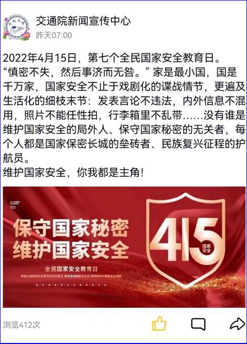 由交通院新闻宣传中心牵头,明确4月15日是第七个全民国家安全教育日,聚焦“树牢总体国家安全教育观,感悟新时代国家安全成就,为迎接党的二十大胜利召开营造良好氛围”的教育主题,普及相关知识,以图文结合的形式在色情app官方QQ、微博同步更新动态,各班级官Q转发、跟评。