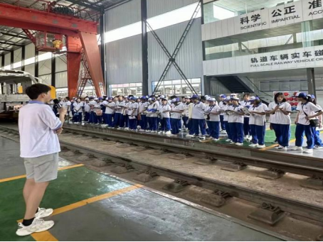 在轨道车辆实车碰撞实验室,志愿者为同学们讲解试验台的主要组成部分——驱动系统、制动系统、刚性墙和测力系统、照明系统以及实验台车,并了解到该试验台的三大创新之处——发射速度高、具备后悔装置、具有瞬时测力墙,使得该试验平台可以在较小的空间里更精确直接的测力。参观完试验台后,在志愿者的带领下,大家一同去外面观察碰撞之后的吸能部件。通过志愿者的介绍,大家了解到这些部件大都来着不同地方,且是小批量定制化的。通过这些了解,大家认识到国家对于铁路行业的重视程度以及铁路人攻坚克难、不懈努力的精神风貌。