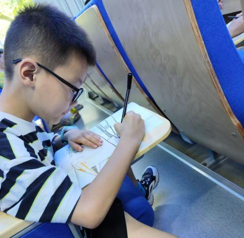 紧接着,在志愿者的有序引导下,同学们进行了“画出心中的火车” 绘画活动。一笔一划之间,或是天马行空,或是栩栩如生,同学们用色彩和线条描绘出了自己心目中独一无二的火车。