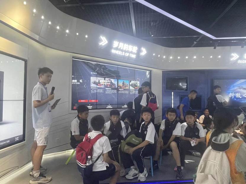随后,志愿者史梓含带领同学们进入气动与碰撞实验室。"车头的流线型设计不仅美观,更重要的是减小空气阻力......" 在碰撞安全实验室,史梓含详细讲解了吸能装置如何通过结构变形吸收能量,以及防爬装置如何防止列车碰撞时发生叠爬行迹。同学们还亲手操作碰撞模拟设备,观察不同缓冲结构的吸能效果,对 "安全设计如何守护出行" 有了具象化认知。